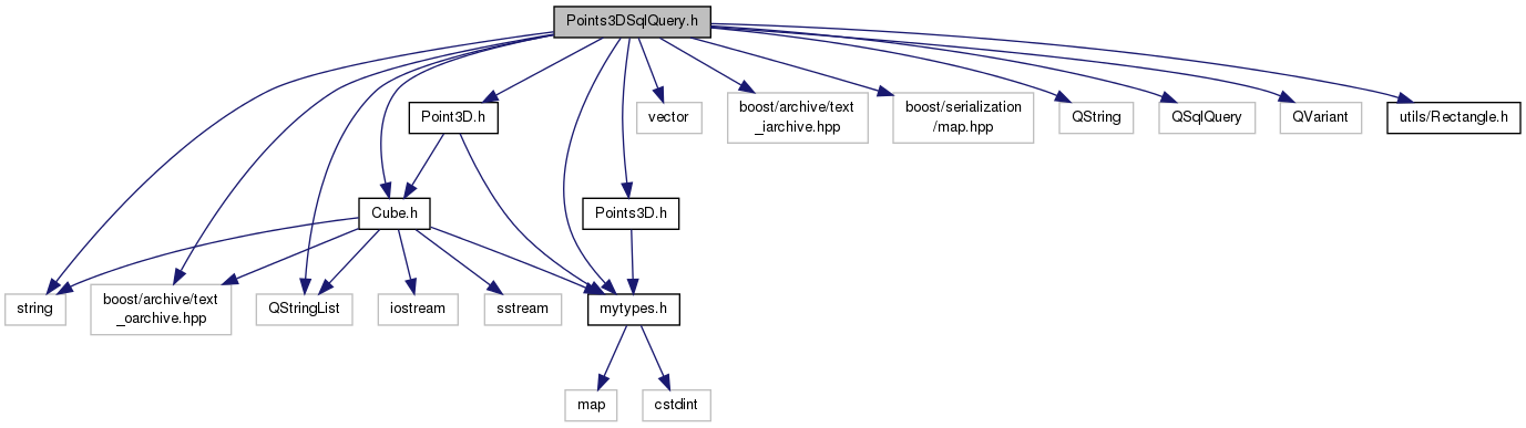#include <string>#include <vector>#include <boost/archive/text_oarchive.hpp>#include <boost/archive/text_iarchive.hpp>#include <boost/serialization/map.hpp>#include <QString>#include <QStringList>#include <QSqlQuery>#include <QVariant>#include "mytypes.h"#include "Point3D.h"#include "Points3D.h"#include "Cube.h"#include "utils/Rectangle.h"